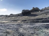 a barren landscape with rocks and bushes near by a road in the desert under a blue sky