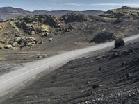A picturesque landscape in Iceland featuring a coastal road surrounded by mountains and overlooking the ocean. The clear sky reflects on the rugged bedrock formations, creating a high elevation experience of nature's beauty.