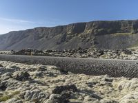 a winding road between boulders and mountains on a sunny day in iceland is shown as a lone car drives by
