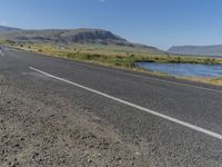 a motorcycle rides down the road in front of a mountain landscape in iceland with a river running through the valley