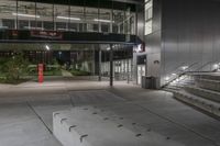The illuminated entrance of a modern office building in Toronto, Canada. The night lights create a dramatic effect, highlighting the architectural design. An empty ramp leads to the bustling business district.