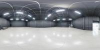 A straight down view of an indoor skateboarding facility in Los Angeles. The concrete flooring and metal ceiling give it an industrial feel. The open space and clear sky create a spacious and inviting atmosphere.