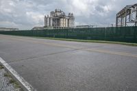 Industrial architecture in Dallas. A concrete street lined with metal fences. Clear day highlights the contrast between the rural surroundings and urban infrastructure. The road's surface is protected by a metal fence against the rain.
