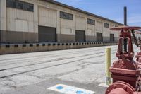 This photo showcases a fire hydrant sitting outside of a warehouse in Los Angeles, California, USA. The red hydrant is situated in the foreground, with a red stop sign nearby. The industrial setting is evident with the presence of the warehouse, which has a concrete facade and a metal roof. The surrounding area includes asphalt roads, concrete surfaces, and a nearby harbor with water. The photo captures the architectural elements of the city, including columns and sculptures. This image represents the intersection between urban infrastructure and industrial landscapes in Los Angeles.