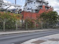 a large ship sitting behind a chain link fence on a street corner with another boat in the background