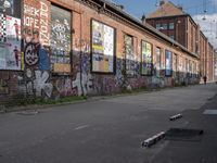 This stock photo showcases a vibrant cityscape in Berlin, Germany. The image captures the essence of urban life with its concrete surfaces, graffiti-filled walls, and industrial buildings. The photo perfectly embodies the atmosphere of an art district, with its colorful graffiti walls contrasting the grey industrial architecture. With a cloudy sky overhead, the image depicts a typical day in Berlin, capturing the energy and creativity of the city. The photo showcases a Hinterhof (courtyard) with a factory warehouse in the background, adding to the urban design of the scene. This image is ideal for projects related to city life, urban spaces, and industrial aesthetics in Europe.