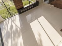 This is an interior view of a modern villa in Los Angeles, California. The room features elevated flooring made of concrete tiles, providing a sleek and modern aesthetic. A glass door on one side of the room offers views of the open space outside. The high ceilings and floor-to-ceiling windows create a sense of expansiveness and allow an abundance of natural light to fill the room. This photo showcases the innovative and contemporary design of the home, making it a desirable property for those who appreciate modern architecture and interior design.