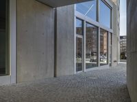 This is an image of a modern office building in Berlin, Germany. The building showcases contemporary architecture with a combination of glass, concrete, and composite materials. The clear sky above highlights the sleek facade and large windows. The urban design of the city is evident in the surrounding roads and business district. Inside, the interior design features wood flooring and fixtures. This photo represents the bustling city life and vibrant real estate market in Berlin.