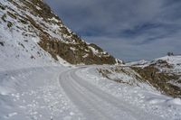 A picturesque mountain landscape in Italy. The road winds through the highlands, surrounded by snowy terrain and curving mountain slopes. The glacial rock walls and icy caps add to the stunning natural beauty of the European garden.