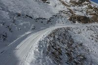 Aerial view of an elevated mountain road in Italy, winding through a snowy landscape. Glacial ice caps glisten under the freezing winter sun. The road provides access to a garden surrounded by towering trees.