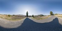 A scenic road in Tuscany, Italy, surrounded by lush greenery and towering trees. The sunlight casts beautiful shadows on the pavement, creating a picturesque landscape. A perfect vacation spot for nature lovers.