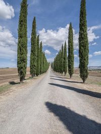 A scenic road in the lush Tuscany countryside of Italy. Surrounded by evergreen vegetation and towering trees, this rural landscape offers a peaceful retreat. Travelers can enjoy recreational activities and explore the natural beauty of Europe.