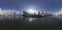 the city skyline is full of skyscrapers and boats in the water in a wide angle