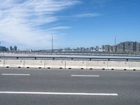 Tokyo cityscape featuring modern architecture and urban infrastructure. Daytime view with a clear sky and a prominent Armco barrier on the bridge. The skyline of Japan's bustling capital city.
