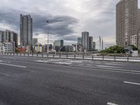 Urban cityscape in Tokyo, Japan during the day. Modern architecture lines the skyline with grey skies in the background. Asphalt road with Armco barriers and bridges showcase the city's infrastructure.