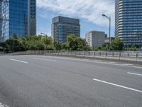 A modern urban cityscape in Tokyo, Japan, featuring a skyline with bridges and Armco barriers. The asphalt road under a clear sky highlights the city's modern architecture.