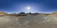 a large area with rocky terrain and blue sky in the background with a sun shining
