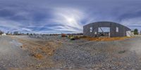 Panoramic view of a construction site in Johnson City, Tennessee. The building's architecture blends concrete, wood, and composite materials. Open spaces, rugged landscape, and contrails in the sky add to the city's charm.