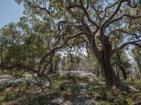 A rugged landscape at Kangaroo Point, Kangaroo Island, Sydney, South Australia. Deciduous trees cast hard shadows on the rocky coast. Clear skies provide a backdrop for the unique vegetation and rugged rock formations.