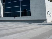 the man is walking down the side walk with his skateboard on his foot in front of a large building