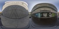 The urban design of Kaohsiung, Taiwan showcases the city's modern architecture. The curved mirror on the side of the building reflects the circular roof of the open space below. A blend of art and urban living in Taipei, Republic of China.