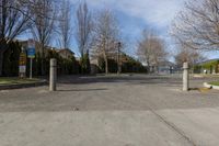 Low angle view of a suburban road in Kelowna, British Columbia. The asphalt road surface contrasts with the autumn foliage of the trees. Open spaces and residential areas create a peaceful atmosphere in this Canadian suburb.