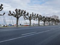 This is an image of a cityscape in Geneva, Europe. The photo captures a view of a road and asphalt leading towards the harbor. The clear sky reflects in the calm waters of the lake, creating a serene atmosphere. In the foreground, a pier and jetty extend into the water, adding to the urban design. This picture represents the beauty and tranquility of city life in Geneva, France.