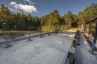 This is an image of an elevated concrete street in Toronto, Ontario, Canada. The landscape features a lake in the background and a grassy area with trees. The road surface is made of asphalt and is bordered by a yellow guard rail. A bridge spans across the lake, with vegetation and a fence visible beneath it. The infrastructure also includes a thoroughfare with a concrete barrier and an Armco barrier. The image captures the high concrete street in Toronto, creating a stark contrast with the natural elements such as the lake, grass, and trees.