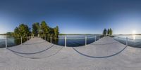 an image of a lake and pier in a panoramic image with lots of sand on it