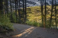 A serene landscape in Ontario, Canada. The clear sky reflects on the calm lake, surrounded by forests and deciduous trees. The asphalt road cuts through the vegetation, casting hard shadows. A picture-perfect day in Toronto.