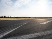 This stock photo captures the urban landscape of Berlin, Germany. The image features an open space, with asphalt road surface and clear blue sky. The cityscape showcases the city life and urban design of Berlin. The horizon extends into a vast plain, adorned with trees. The sun is visible, creating a sunny and vibrant atmosphere. The road is a main thoroughfare, surrounded by tints and shades of green grass. The photo perfectly embodies the vibrant energy and beauty of Berlin, with its combination of urban elements and natural surroundings.