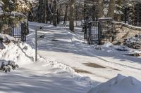 This is an image of a rural landscape in Ontario, Canada. The photo captures a forested area with a road running through it. The scene is illuminated by sunlight, highlighting the trees and vegetation. A branch from one of the trees extends towards the foreground. The woody plants create a natural barrier, with a fence and gate providing an entry point. The terrain is slightly elevated, creating a sloping driveway. This picture depicts the frozen and freezing conditions typical of the winter season in Ontario.