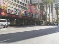 A white van is parked on the side of the road in front of a movie theater in Las Vegas, Nevada. The palm trees and casino buildings in the background create a classic scene of the city. It's a sunny day in the entertainment capital!
