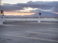 a parking lot with the sun shining on the horizon and mountains in the distance as clouds gather in the background