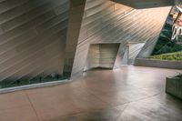 this walkway has multiple open levels with some plants inside the area on each side of the door