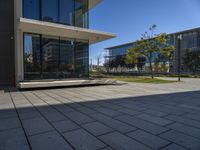 This is an image of a modern office building in Lisbon, Portugal. The building stands in the middle of an open courtyard surrounded by trees and other buildings. The clear sky above casts hard shadows, emphasizing the architectural design and urban setting. The surface of the courtyard is paved with asphalt, creating a sleek and clean look. This photo represents the urban life and business district of Lisbon, showcasing the combination of modern architecture and natural vegetation.