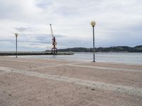 This photo captures the scenic coastal landscape of Lisbon, Portugal. The cloudy sky creates a dramatic backdrop for the empty waterfront, with a crane in the background. The road surface, lined with street lights, leads towards the horizon, where the ocean meets the sky. The pier and the jetty add to the open space and the charm of the coastline. This image represents a typical day in Lisbon, with its beautiful landscape, European charm, and proximity to the water.