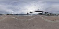 A fish-eye view of Lisbon, Portugal featuring a bridge and other architectural structures. The grey sky and gloomy atmosphere add a touch of mystery to the scene. The calm waters of the ocean and the city's open spaces create a harmonious urban design.