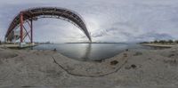 the fish eye lens view shows a bridge as it's in motion through the water