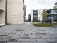 there is a sidewalk with lots of blocks in it between tall buildings and trees in the background