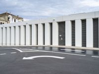 An empty parking lot in Lisbon, Portugal. Modern office buildings and a business district surround the grey asphalt surface. White columns and road signs add architectural accents. A tranquil day in Lisbon's business infrastructure.