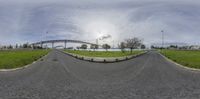 a fisheye lens is showing a view of the road in a wide angle and the sky in the background