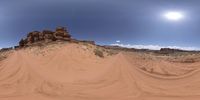 Lock Hart Road winds through the rugged and elevated landscape of Utah's red desert. The clear sky contrasts with the natural environment, showcasing the stunning rock formations and mountain landforms. A perfect day for off-road exploration in the Canyonlands National Park.