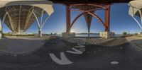 Underneath a long bridge in Lisbon, Portugal, with a view of the coastal harbor and open space. The composite material bridge casts a shade on the graffiti-covered walls. The sun shines through the underpass, creating tints and shades on the road and water surface.