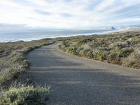an empty, lonely road along the coast on a sunny day by the beach with waves in the ocean behind it
