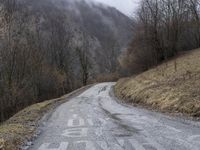 This stock photo captures a picturesque scene of a lonely, empty road cutting through a hilly area with mountains in the distance. The road surface is made of asphalt and appears wet, hinting at recent rainfall in the winter season. Surrounding the road are trees and a beautiful natural landscape. The image depicts the infrastructure of a thoroughfare in the highlands of France, part of the stunning Alps mountain range in Europe. The gloomy grey sky adds a touch of atmosphere to the scene.