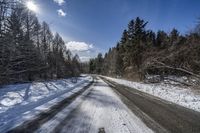 This stock photo portrays a winter landscape in Ontario, Canada. The image shows a straight road made of asphalt that cuts through a dense forest with tall trees covered in snow. Along the sides of the road, snow-covered branches add to the scenic beauty. The photo was taken during the day, with clear skies and sunlight visible. The winter season is evident from the presence of snow and the bare branches of the trees. The road surface is visible, while vegetation is present on both sides. This serene and sunny winter scene captures the beauty of nature in Ontario, Canada.