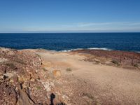 An elevated view of the Sapphire Coast in New South Wales, Australia. Azure waters, clear skies, and a pristine beach create a stunning landscape. Dirt and gravel paths lead to the sandy shore, perfect for outdoor activities and recreational pursuits.
