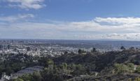 A stunning aerial view of the Los Angeles skyline from a cliff near the hills. The modern architecture and towering skyscrapers create a vibrant cityscape. The city is surrounded by mountains and the sea, providing a unique urban design. Experience the metropolitan life from this elevated viewpoint.