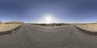 A straight asphalt road in Los Angeles, California, stretches under a clear sky. The desert landscape offers a classic USA driving experience, showcasing the vast open space and natural beauty of the region.
